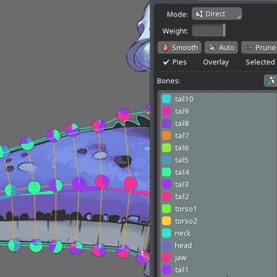 Pressing Ctrl (Cmd on Mac) temporarily pauses the animation, making it easier to select the vertices with the weights direct tool.