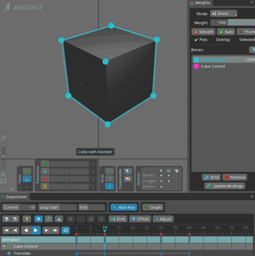 Here is the same cube mesh, with the same set of bones, but with the weights reversed so the mesh pivots around the bone in the back of the cube. The reversal is done by inverting the weights and the list of bones the mesh is weighted to.