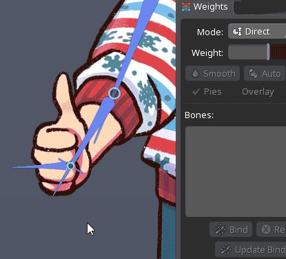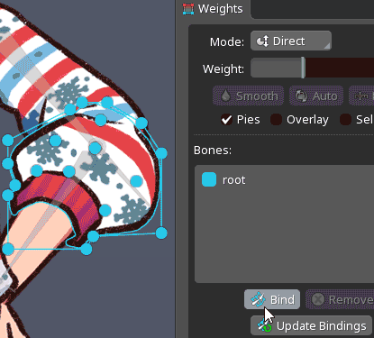 Go back to setup mode and activate the mesh, which now shows in its undistorted state in setup mode, then click Edit Mesh. Once your mesh modifications are complete, switch to animate mode, activate the setup pose animation and press update bindings to store the correct bone positions.