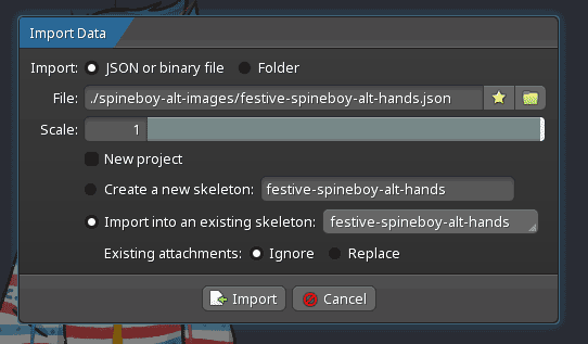 To import the new assets, open the Spine project you wish to import the new assets into (in our case that's 1-festive-spineboy.spine inside the folder 1-festive-spineboy-start/). Next, choose Import Data or drag and drop the JSON file on the Spine window to open the Import Data dialog (in our case that's the file festive-spineboy-alt-hands.json in the folder 2-spineboy-alt-images).
