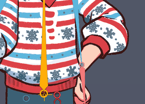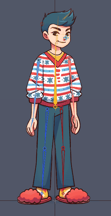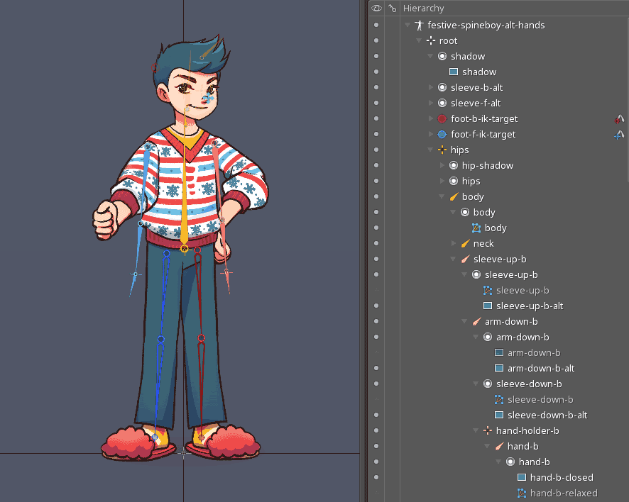 By using the [slot] tag and names in your Photoshop project that match the existing slots in your skeleton, Spine can automatically import your new assets in the correct place. For our festive Spineboy, we've created additional assets in the Photoshop project that you can find in the folder 2-spineboy-alt-images/ in the materials download accompanying this blog post.