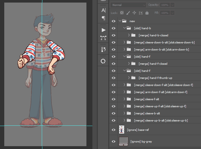 Let's imagine that you have already rigged a character and you want to add a new pose in the middle of an animation. The first step is creating the additional assets required for the new pose. You can use Spine's PSD export to create a reference for your work for Photoshop or other image editing software. This is especially useful to create new assets for an animation, such as a torso with a different perspective. The PSD export gives you layers for all the attachments of an entire mid-animation pose, so you can more easily draw new attachments.