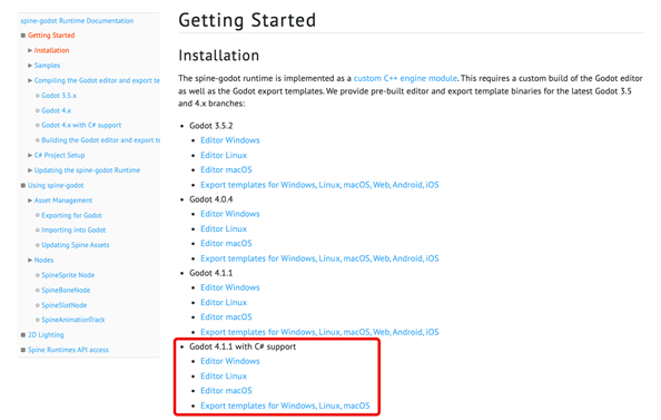 You can download our pre-built Godot 4.1 editor and export template binaries with C# support from the spine-godot runtime documentation. Follow the documentation there for basic installation instructions.