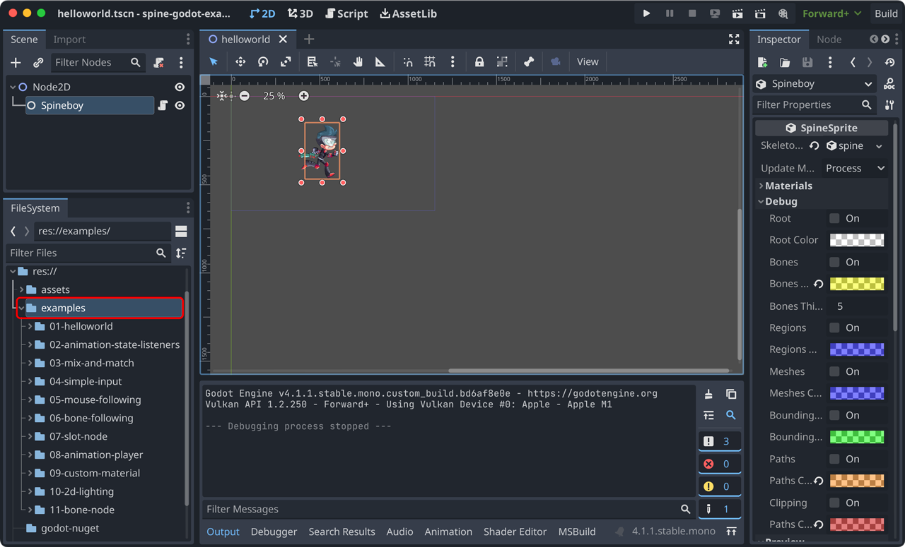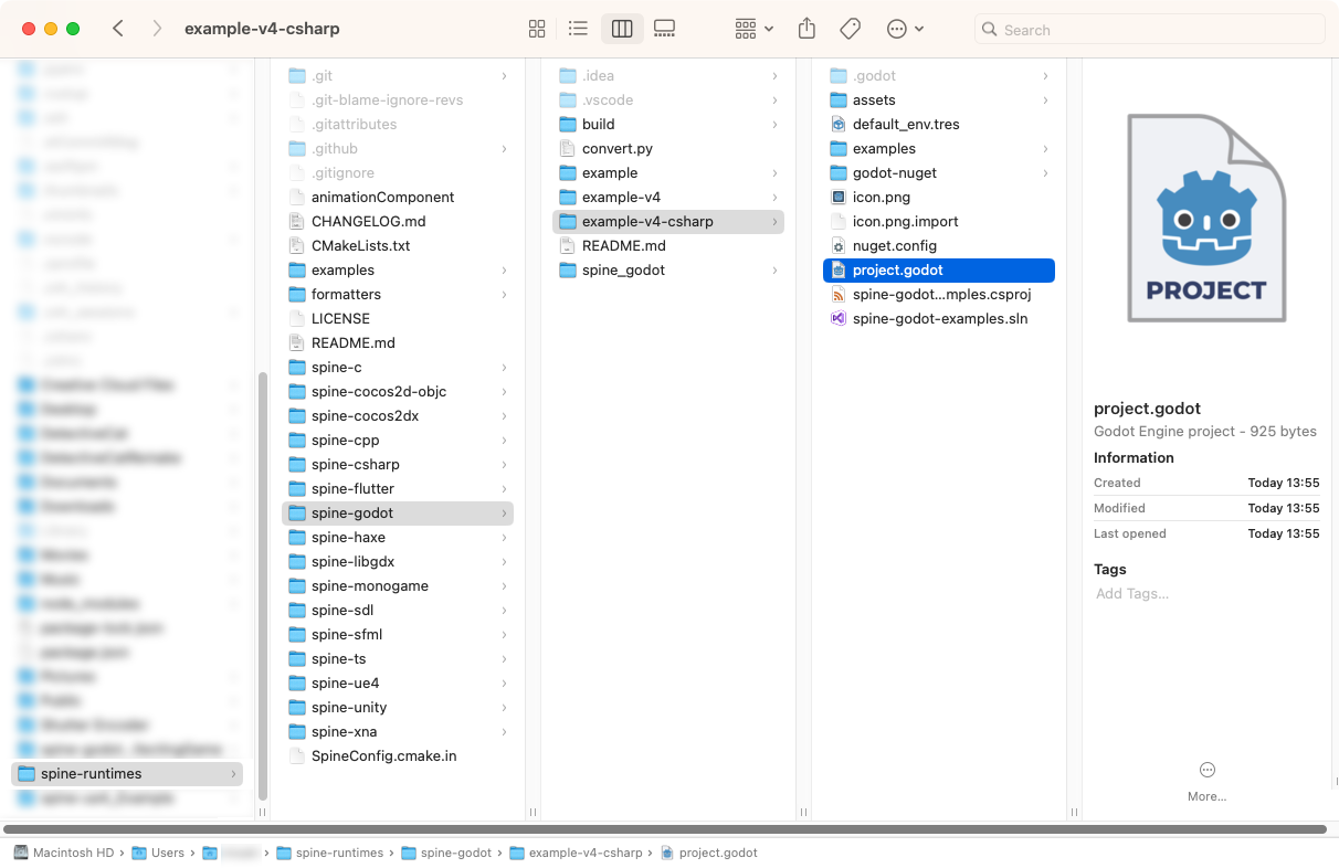 spine-runtimes/spine-godot/example-v4-csharp/folder and click theproject.godotfile to open it.
