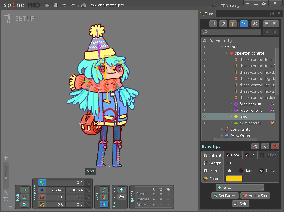The goal of this exercise is it to create a skin variation that not only affects the set attachments, but also the proportions of the character. Specifically, we want the skin to make the character smaller. The technique described below can of course also be applied to create taller, skinnier, or fatter characters, and anything in between.