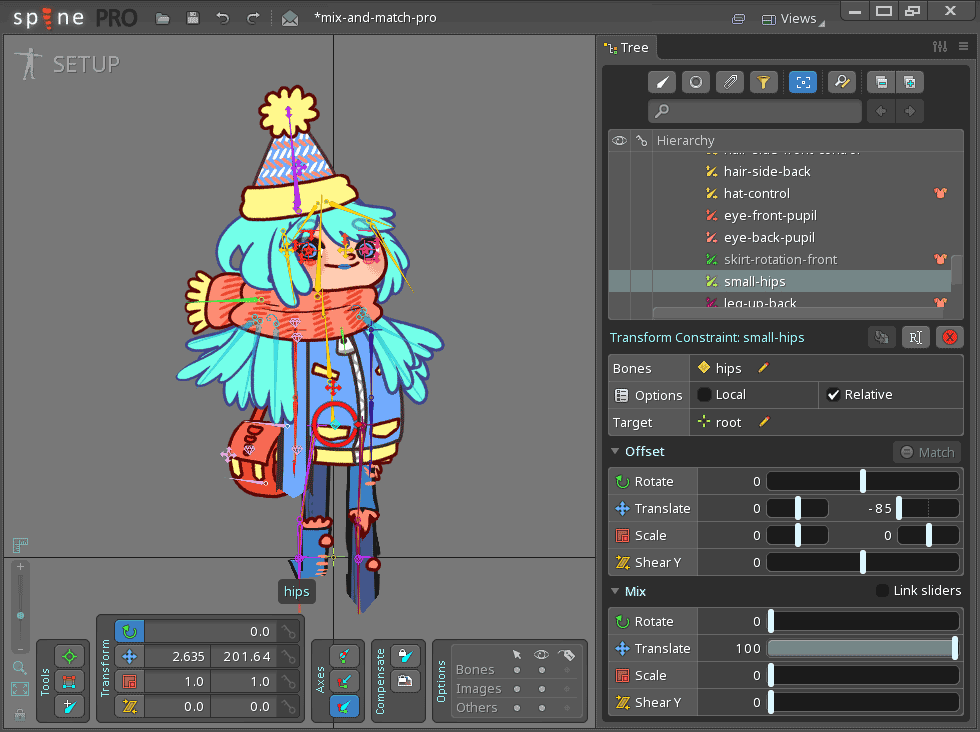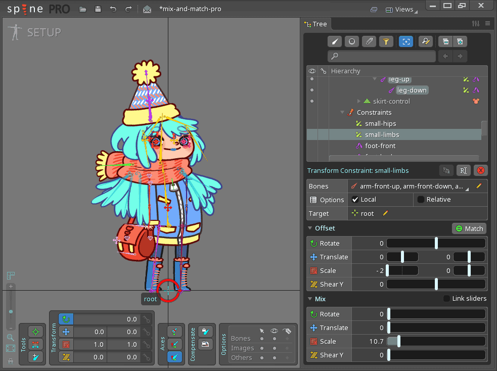 With the small-hips constraint selected in the tree, check the Relative option and set the translate mix to 100. The constrained hips bone will now follow the translation of the root bone. The hips bone will be offset relative to the root bone by the translate offset set on the small-hips constraint.