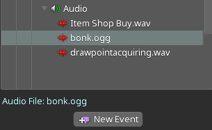 Once you've placed an audio file in the (sub-)folder the audio node's path points to, it will show up under the audio node. Selecting the audio file will allow you to create a new event from the audio file.