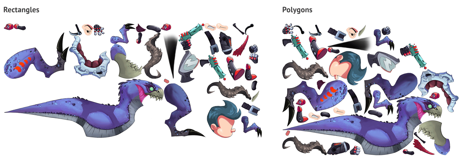 Spine can now do polygonal texture packing. When chosen in the texture packer settings, mesh attachment vertices are used to pack images as tightly as possibly. This lets you fit more images into each texture atlas page and reduces the size of your exports.