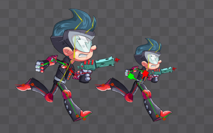 Here Spineboy's back thigh has been scaled on the X axis (the scale tool's red axis) which elongates the thigh, shin, and foot along their local X axes. This is almost never the desired result, so many Spine users disable scale inheritance. Also, this non-skewing scale prevents scaling to -1 to flip a bone and prevents doing squash and stretch on an entire skeleton. These are some pretty big drawbacks!