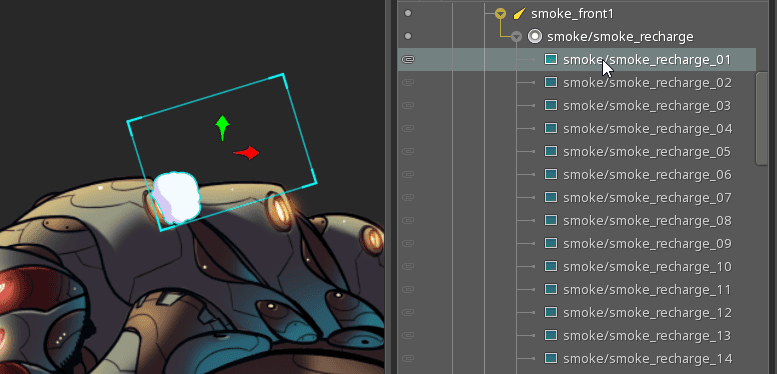 To animate this smoke using frame-by-frame in Spine 4.0 and earlier, you'd need to key each image change at the right time. That gives you total control over when each frame is shown, but it is time consuming to attach all the images to the slot and create all the keys. It is also difficult to change, for example to change the frame rate you would need to move every key.