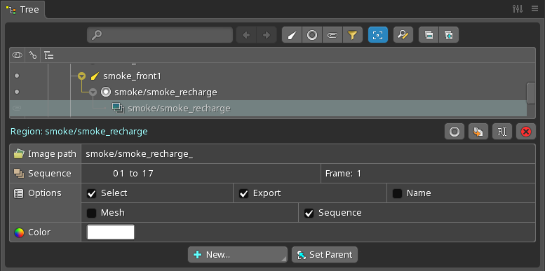 We also need to set the start and end frames to 01 and 17 to match our 17 image files. The leading zero is important because the numbers in our image file names have a leading zero. Without it, Spine would look for smoke_recharge_1, smoke_recharge_2, etc.