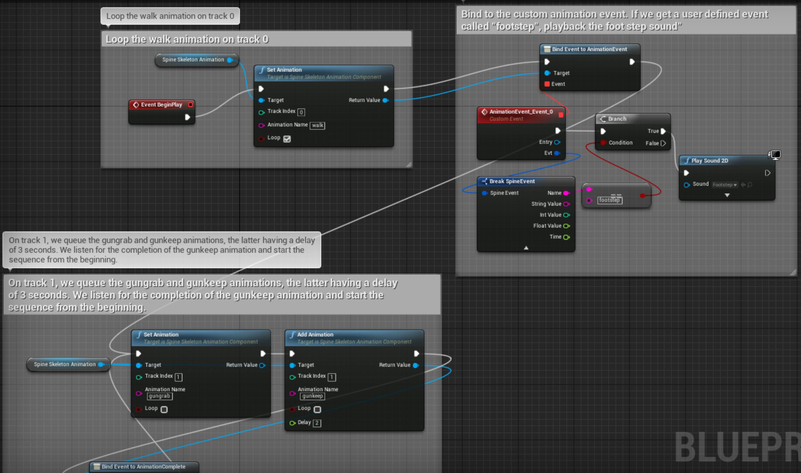 The spine-ue runtime is based on spine-c and exposes the entire API through both Blueprint nodes as well as C++ components you can easily add to your game objects. Check out the extensive spine-ue documentation to get started and try out the sample project.