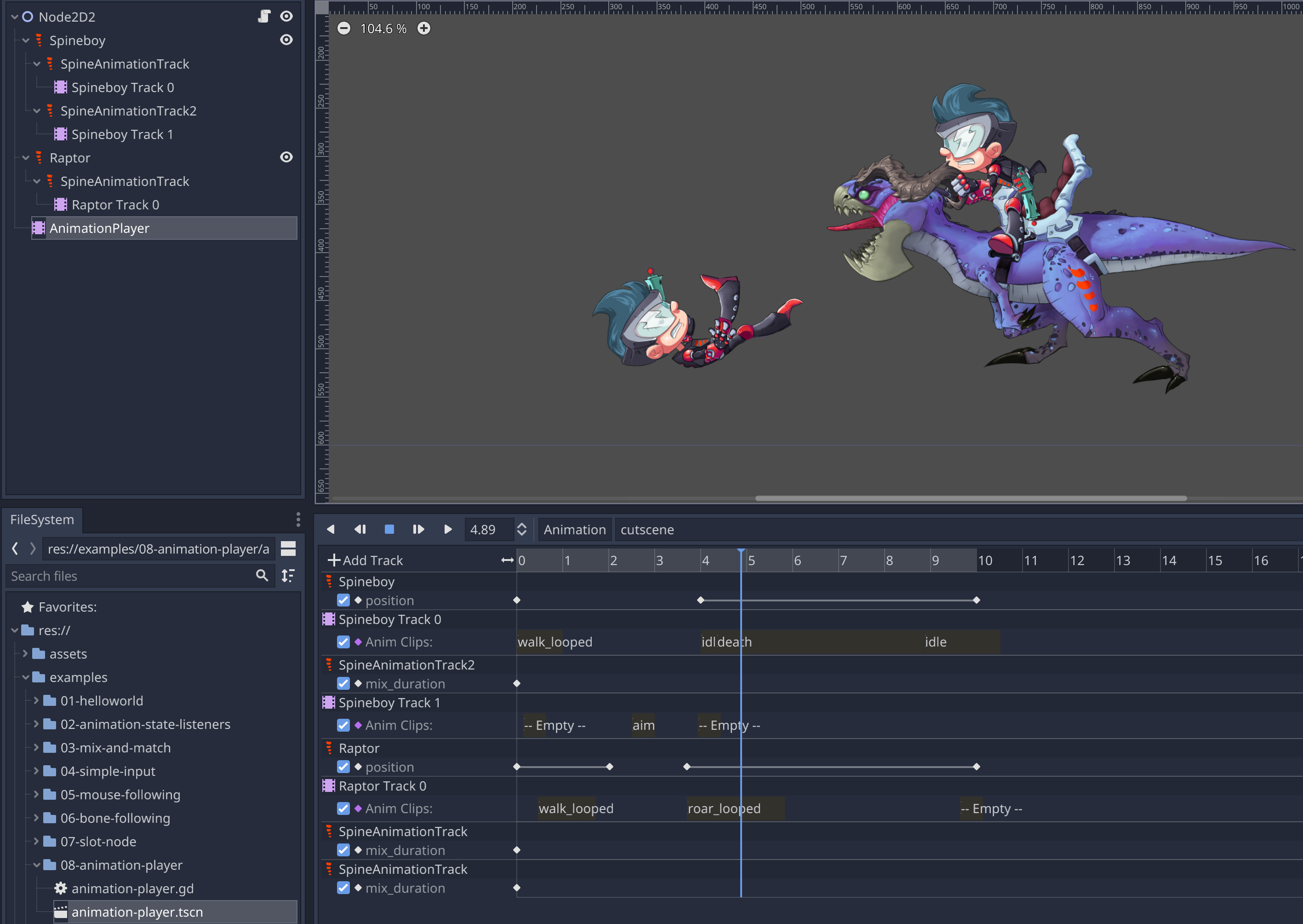 What's in the box? spine-godot surfaces almost all of the spine-cpp API to GDScript. On top of this, we've built a handful of Godot node types that make drawing and modifying your Spine skeletons in Godot a joy. And our resource management ensures that your exported Spine files are easy to import and update. Check out our spine-godot documentation and the extensive example project, which demonstrates all of spine-godot's features.