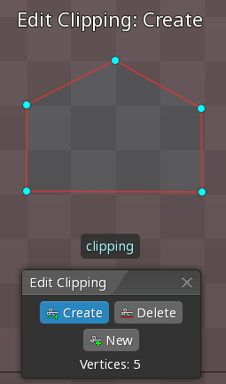 The Create tool allows new vertices to be created along the clipping attachment edges by clicking. Drag to translate a vertex. Double click to delete a vertex.