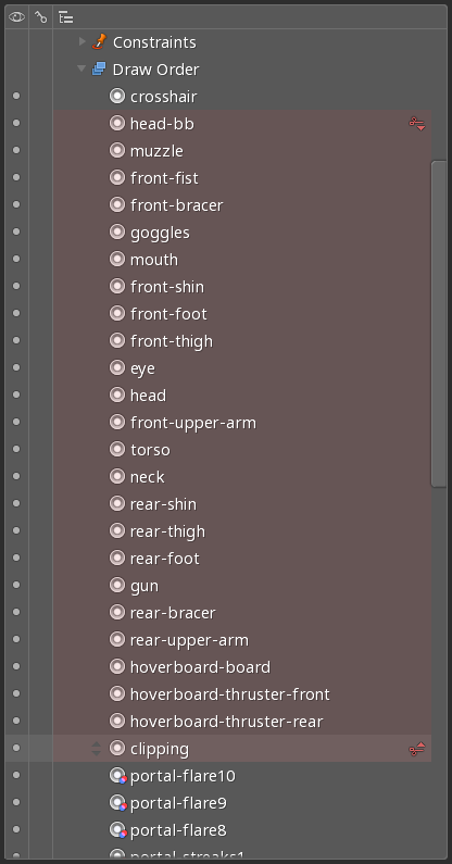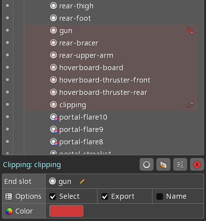 By default, a new clipping attachment's end slot is set to the slot that contains the clipping attachment. The result is that clipping is done from the clipping attachment's slot to the end of the draw order (all slots above the slot in the draw order). The clipped slots are highlighted in red in the tree.