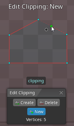 The New button deletes all vertices and enters the new vertices mode. This mode allows the clipping attachment to be defined by clicking to create new vertices. Vertices can also be translated by dragging or deleted by double clicking. To complete the vertices, exit the new vertices mode by clicking the first vertex to close the polygon or by clicking the New button again.