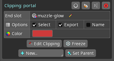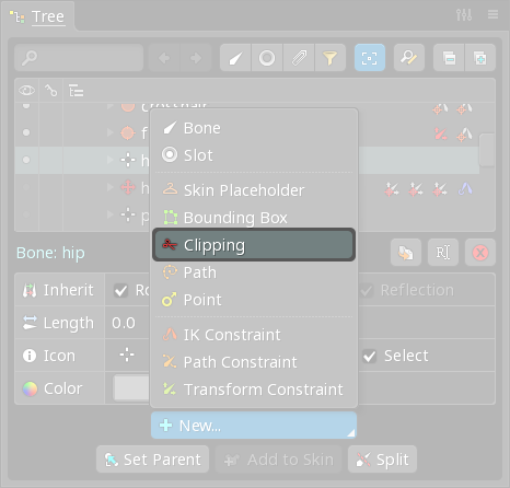 To create a new clipping attachment, select a bone or slot in the tree, then choose New... Clipping in the tree properties.