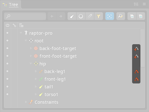 The right edge of the tree displays annotation icons for bones that are constrained by or the target of a constraint. The icons can be clicked to select the constraint.