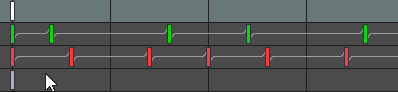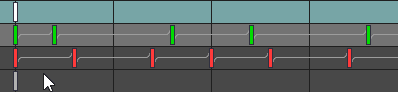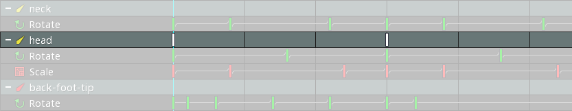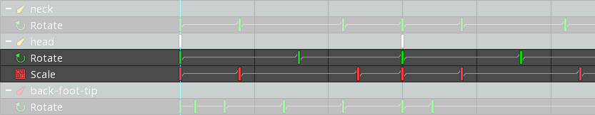 Under a bone row are property rows for each keyed property. The property row shows all the keys for that property. Lines between keys indicate the type of interpolation between the keys.