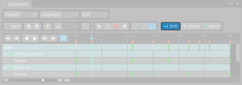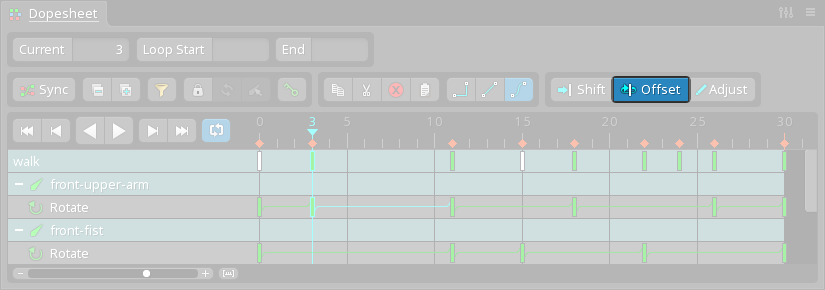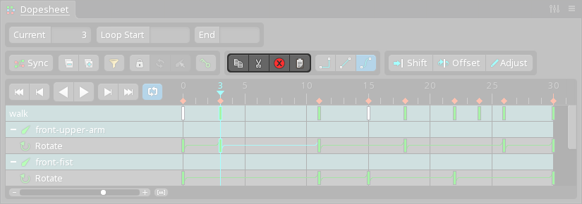 For example, a bone has three rotate keys: 0, 50, and 85 degrees. Select these keys in the dopesheet and enable Adjust, then use the Rotate tool to rotate the bone by 15 degrees. The selected keys are modified by adding 15 degrees to each value, so the keys become: 15, 65, and 100 degrees.