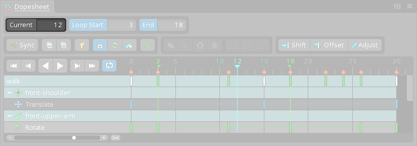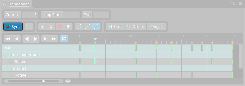 When the dopesheet view is directly above or below the graph view and Sync is enabled, the zoom level for the timelines in both of the views are synchronized so that the keys in both views are aligned horizontally. This allows using the graph to adjust key values while also using the dopesheet to adjust timing and see many keys at once.