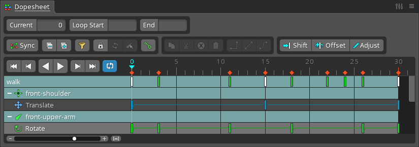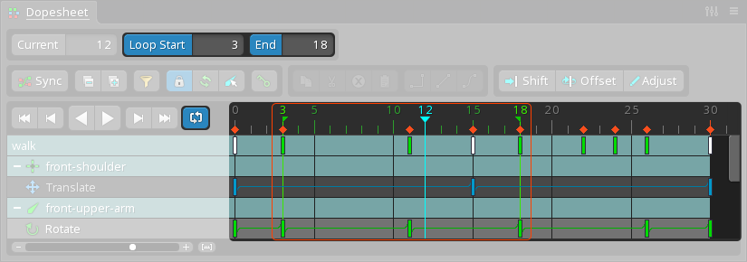 To set the start or end frame, set the timeline position then click the Loop Start or End button. Alternatively, type a frame number in each box. When both have been set and repeat is enabled, playback is limited between the specified start and end frames. This only controls how playback repeats, it is not stored per animation.