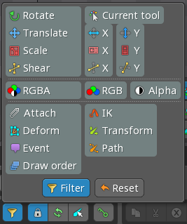 The dopesheet can be filtered to show only the chosen types of properties. Click the filter button to select the property types that will be shown. When a filter is active, the filter button is red.