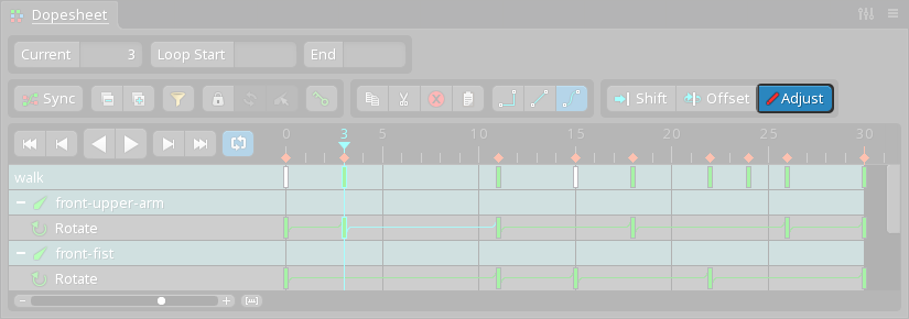 Adjust allows multiple keys to be edited at once. When Adjust is enabled and the Rotate, Translate, Scale, or Pose tool is used to manipulate bones in the viewport, all the selected keys are adjusted relatively by the same amount.