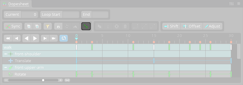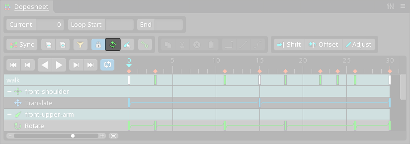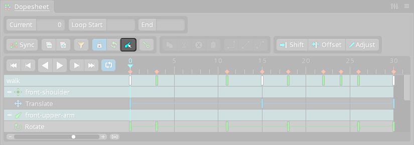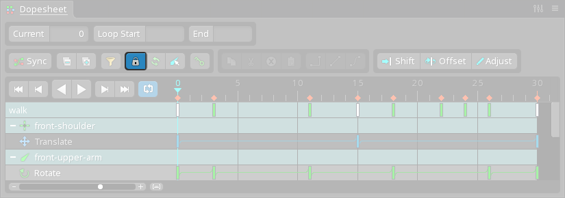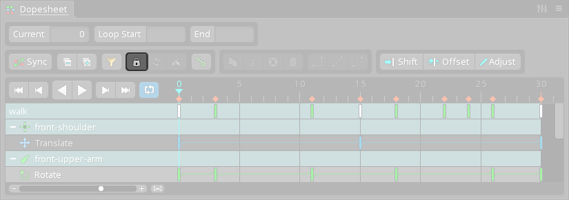 The dopesheet is unlocked by default. When unlocked, which bone rows are shown depends on the viewport or tree selection. If bones (or items under a bone) are selected, only the bone rows for those bones are shown. If no bones are selected, then all bone rows are shown.