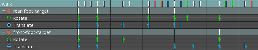 Below the timeline, rows are shown for each keyed property, grouped by bone. Each row has colored rectangles that represent the keys. A unique color is used for each type of key. White keys indicate multiple types of keys on the same frame.