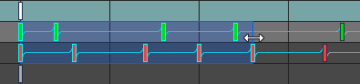 The left or right edge of a box selection can be dragged to scale the selected keys. Scaling keys increases or decreases the timing between the selected keys. When used on the overview row, scaling can increase or decrease the duration of the entire animation.