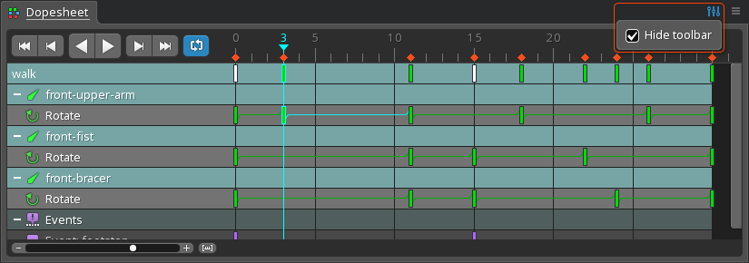 When a project has multiple skeletons, an overview row will appear above the rows for each skeleton. Hiding a skeleton in the tree will also hide it in the dopesheet.