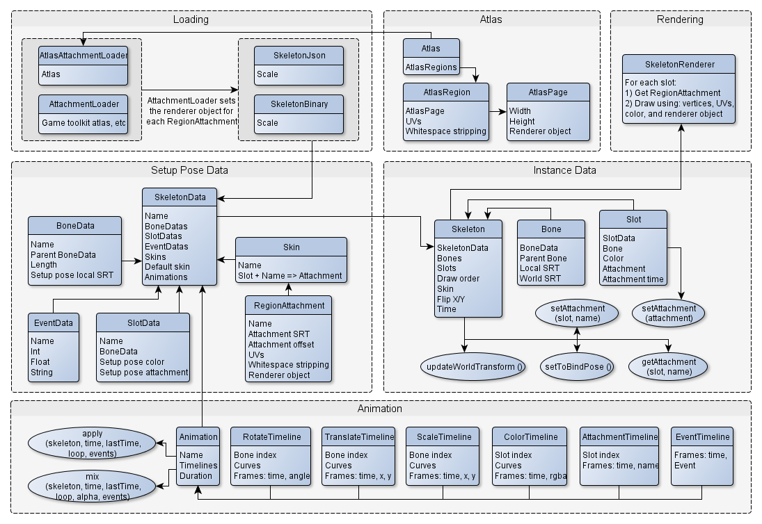 The JSON format is the serialized version of a "skeleton data" instance, which has a list of bones, slots, skins, and animations. This is stateless data that is not tied to a particular on-screen skeleton instance.