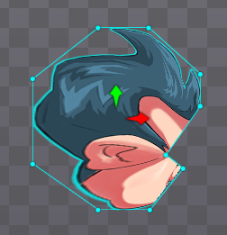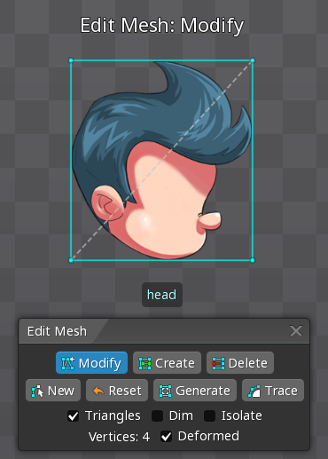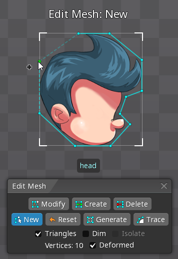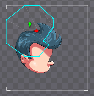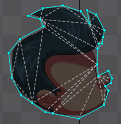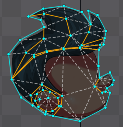 In addition to vertices, a mesh also has "edges" which are connections between vertices. Spine automatically handles the edges around the mesh hull, shown in cyan. Inside the hull, Spine automatically connects all the vertices with edges, shown as dashed gray lines in edit mode when Triangles is checked.
