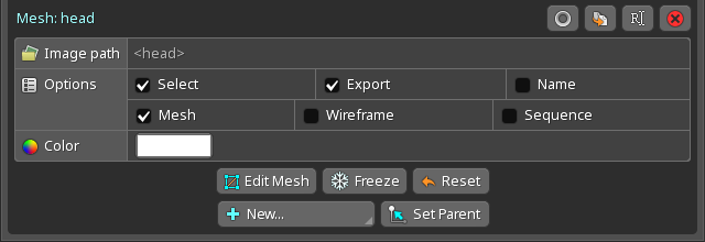 The New button deletes all vertices and enters the new vertices mode. This mode allows the hull of the mesh to be defined by clicking to create new vertices. Vertices can also be translated by dragging or deleted by double clicking. To complete the mesh hull, exit the new vertices mode by clicking the first vertex to close the hull or by clicking the New button again.