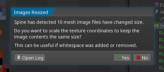 If an image file a mesh uses is made larger outside of Spine, Spine will ask if you would like to scale the texture coordinates to keep the image contents the same size.