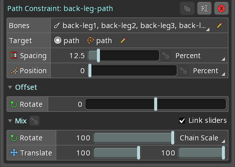 Chainfirst translates the bone to be at the tip of the previous bone, then rotates the bone so it points at the next position along the path, determined by spacing. When the rotation offset is not zero, the translation is not applied. When the path bends sharply, the previous bone tip may not be on the path (see image below).Chainis useful when the bones represent something rigid, such as tank treads.