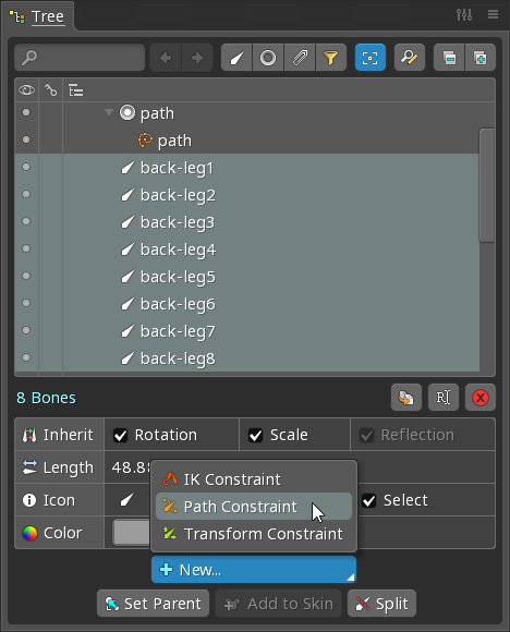 To create a path constraint, select the bones to be constrained, then click New... Path Constraint in the tree properties. Next, choose a slot in the tree or an existing path in the tree or viewport.