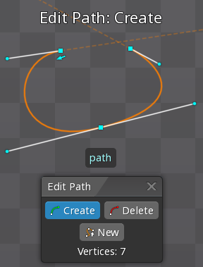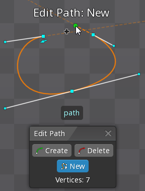 The New button deletes all vertices and enters the new vertices mode. This mode allows the path to be defined by clicking to create new knots. Drag to create a knot and adjust its handles. Vertices can also be translated by dragging or deleted by double clicking. To complete the path, exit the new vertices mode by clicking the first vertex to close the path or by clicking the New button again.