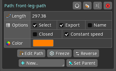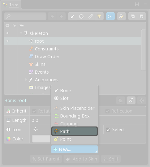 To create a new path, select a bone or slot in the tree, then choose New... Path in the tree properties.