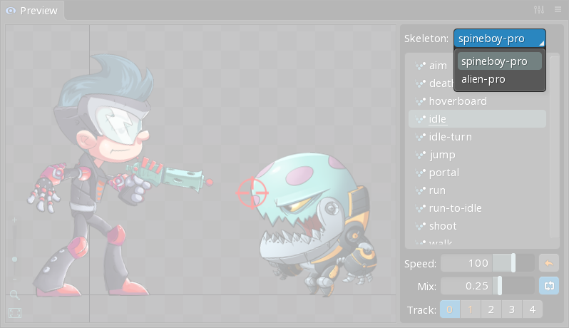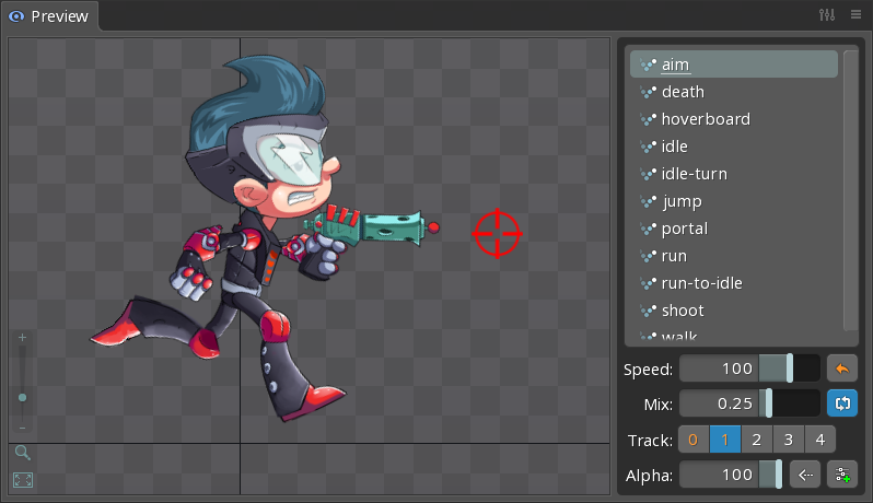 The preview view allows animations to be played using many of the same controls that are available at runtime. This includes mixing (crossfading) between animations, playing multiple animations at the same time on different tracks, and combining animations additively. The preview view is also useful to see an animation playing while editing the setup pose or animation.