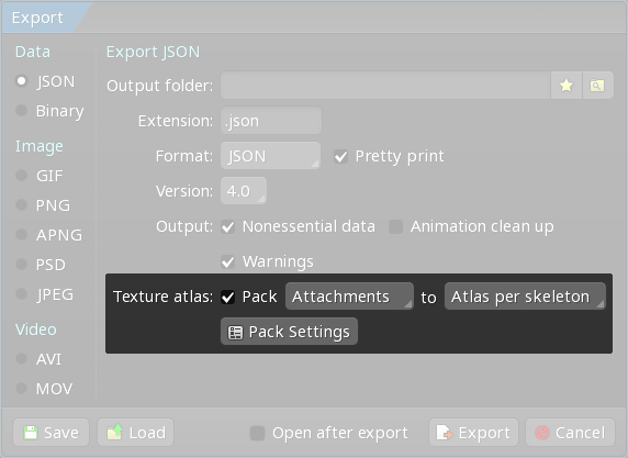 AttachmentsWhen chosen, only the image files used by attachments are packed. Any pack.json files are not used.Image foldersWhen chosen, the image files found in each skeleton's images path are packed. This allows use of a pack.json file to configure packing for each folder.