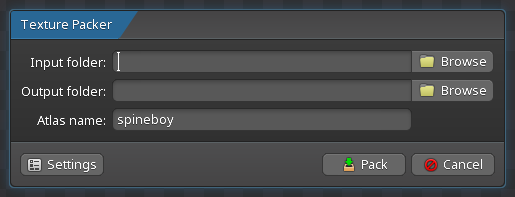On the texture packer dialog, specify the folder containing the images to pack, where to write the atlas files, and the name of the atlas.