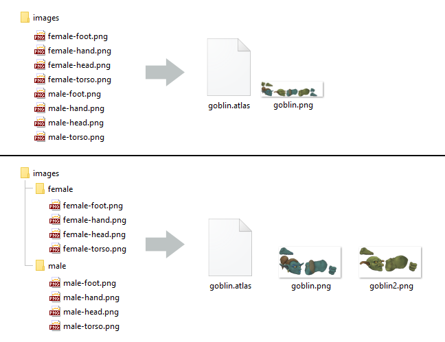 Subfolders are also useful to group images with related texture settings. Settings like runtime memory format (RGBA, RGB, etc) and filtering (nearest, linear, etc) are per texture. Images that need different per texture settings need to go on separate pages, so should be placed in separate subfolders.