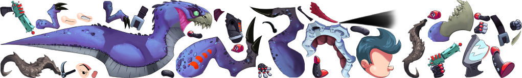 In most graphics APIs (for example, OpenGL), a texture is bound, some drawing is done, another texture is bound, more drawing is done, and so on. Binding the texture is relatively expensive, so it is ideal to store many smaller images on a larger image, bind the larger texture once, then draw portions of it many times. Spine can efficiently pack many smaller images into larger images, resulting in what is called a "texture atlas".