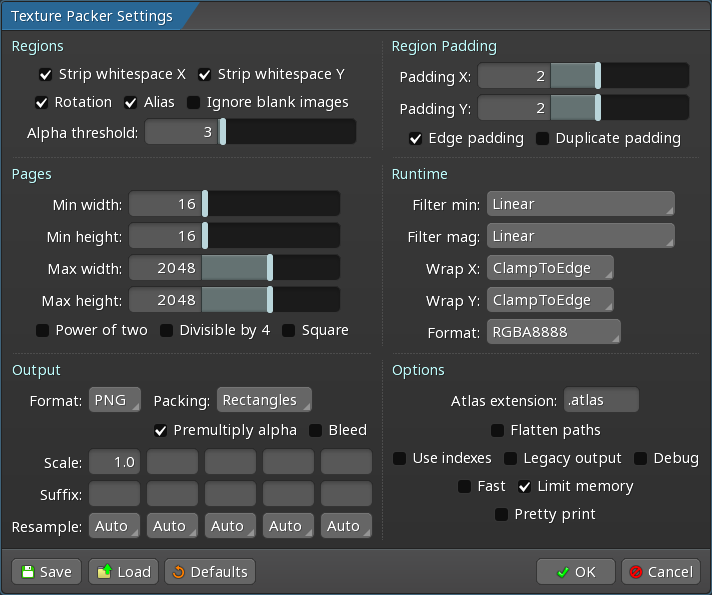 | Padding X/Y | The number of pixels between packed images. Some texture filtering averages neighboring pixels, so a padding of 2 is recommended to avoid neighboring regions from affecting each other. |