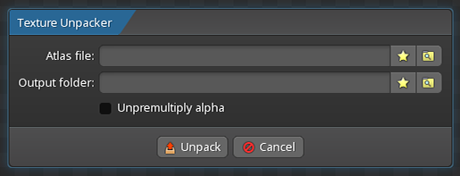 Enter the path to the Atlas file and the Output folder, which is the path to the folder where you want the unpacked images to be stored. Check Unpremultiply alpha if the atlas was packed with premultiplied alpha. If the atlas file has "pma:true", that will be used instead of this checkbox.
