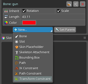 To create a transform constraint, select any number of bones to be constrained, then click New... Transform Constraint to enter choose target mode. Choose the target bone by either clicking an existing bone or click in empty space to create a new bone. The target bone cannot be a descendant of the constrained bones.