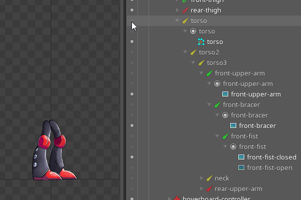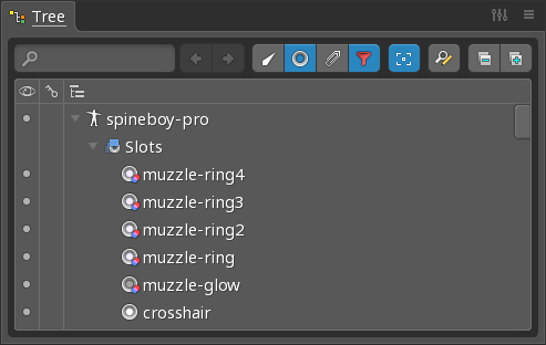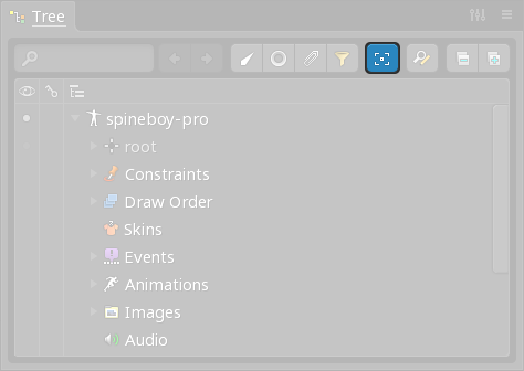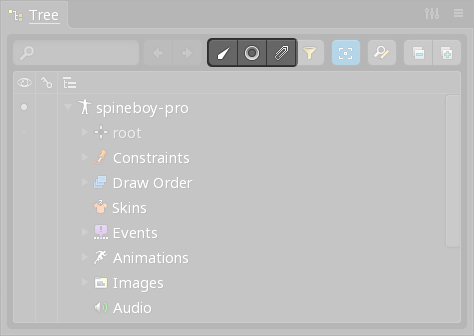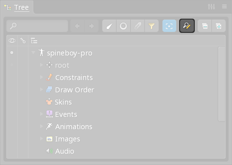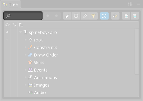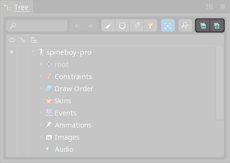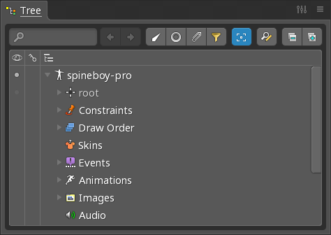 The tree view provides a hierarchical view of your skeletons and everything they contain. The tree is central to using Spine and has many features to make navigating your project easier.