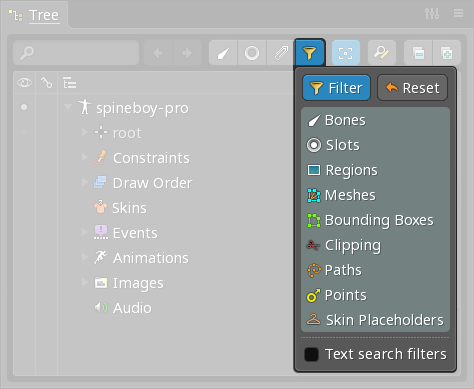 Any time the task is to select a particular type of tree nodes, the tree filters can be useful. For example, if you need to choose a path in a complex skeleton, you could filter to show only path attachments. Or you can filter the tree to show only region attachments so you can more easily select many region attachments to turn them into mesh attachments.